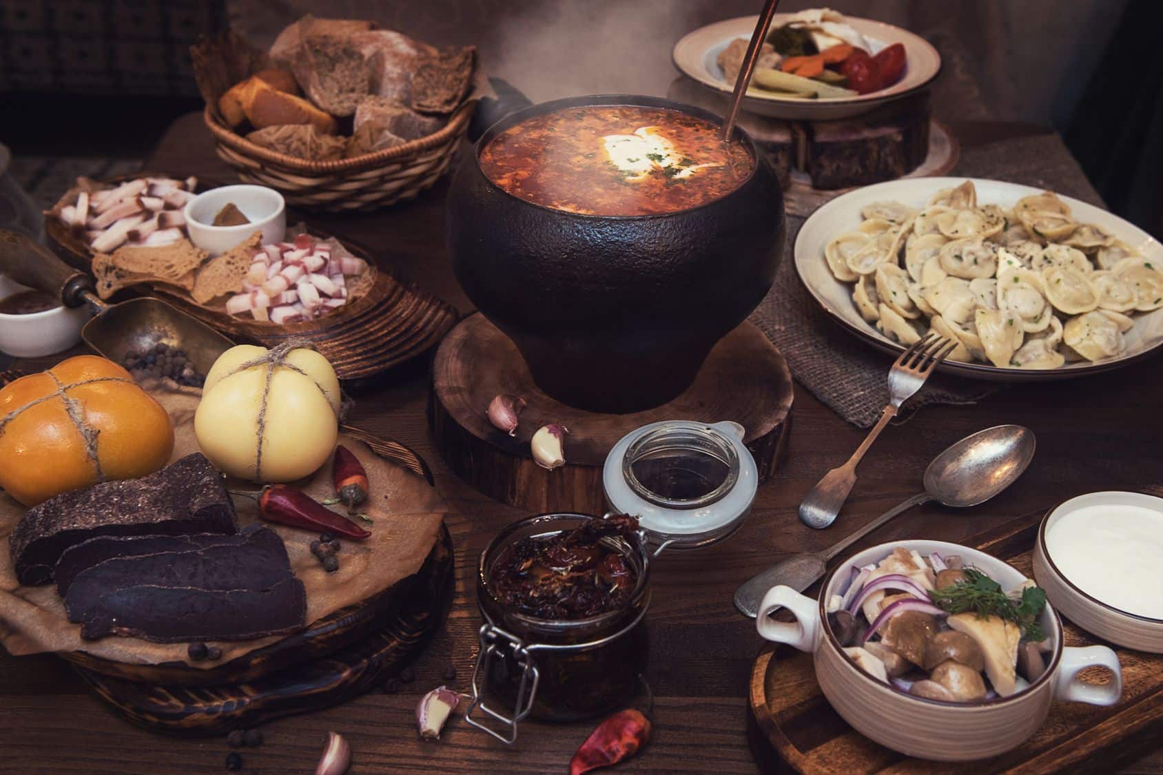 Основа русской кулинарии — сытность, использование местных продуктов и особые методы обработки: томление, квашение, соление. Ключевые блюда: супы (щи, борщ), разнообразная выпечка, каши и закуски. Традиционные напитки — квас, морсы, медовуха — были частью повседневного и праздничного стола.